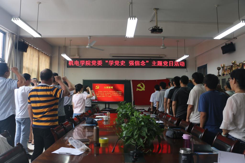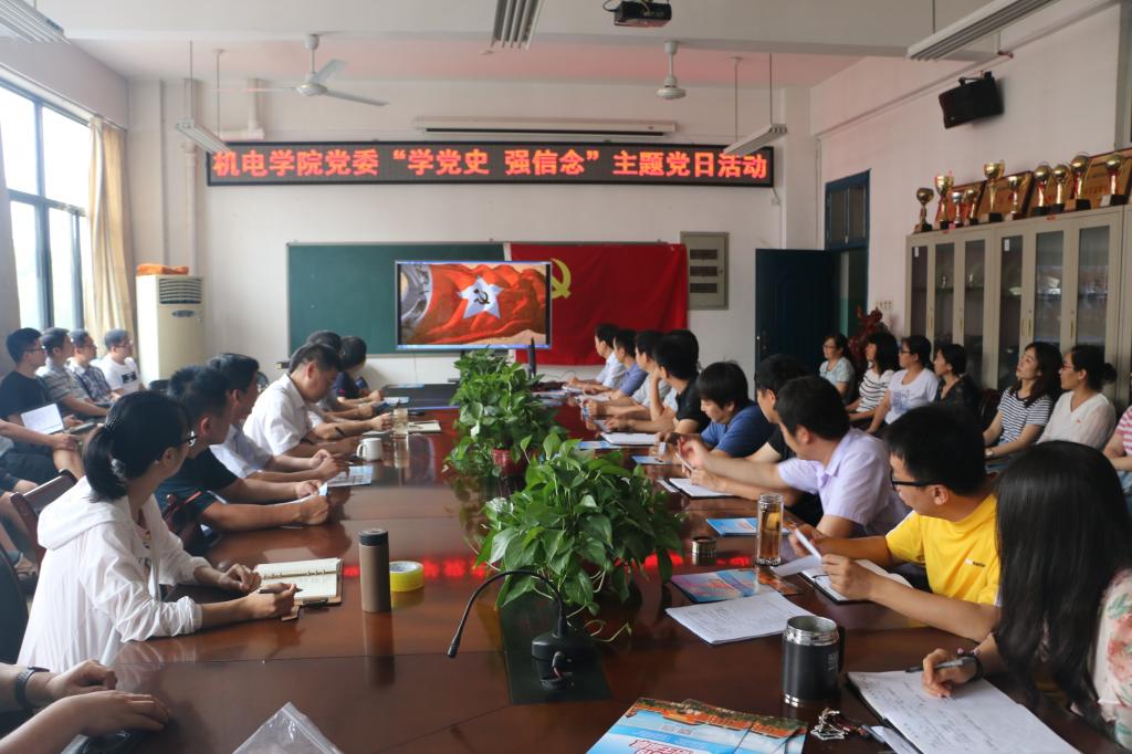 为进一步坚定理想信念,牢记初心和使命,2019年6月28日下午,机电学院在3404会议室召开“学党史 强信念”主题党日活动。学院党政领导班子成员和全体教工党员参加了活动,活动由党委书记樊跃峰主持。