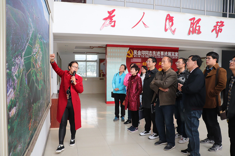 在唐公山荒山绿化教学现场,讲解员讲述了全国政协委员、改革先锋、最美奋斗者吴金印同志带领群众苦干13年,人工开凿出600多万个鱼鳞坑,种植各种绿化林木800多万株,把过去4500亩跑水、跑土、跑肥的“三跑田”变成高产稳产“三保田”的艰难过程。