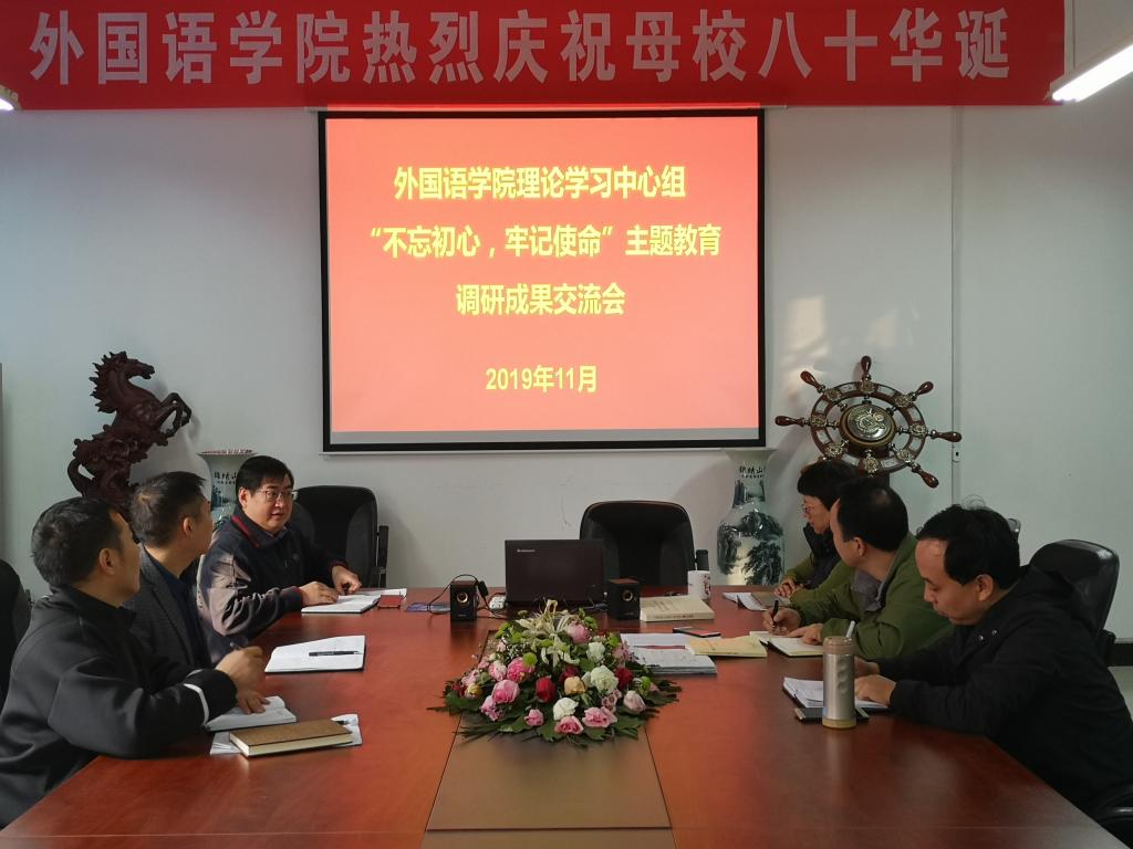 为促进调研成果的转化运用,把好的经验固化为促进学院发展的成效机制,11月14日,外国语学院“不忘初心、牢记使命”主题教育专题调研成果交流会在7#211会议室举行,学院领班班子全体成员参加会议。