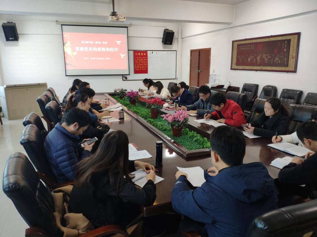 会上,学生第三党支部书记项丰娟以PPT的形式,对发展党员工作程序,包括“申请入党、入党积极分子的确定和培养教育、发展对象的确定和考察、预备党员的接收、预备党员的教育考察和转正”五大流程进行了重点梳理和讲解,使各支部书记、委员进一步明确了发展党员工作的程序和要求。
