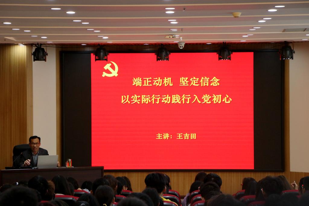 10月25日下午,高职学院第51期党的基本知识培训班开班典礼在综合楼四楼报告厅举行。高职学院党委书记王吉田以《端正动机 坚定信念 以实际行动践行入党初心》为题,从“什么是入党动机”、“入党动机重要吗”、“什么是正确的入党动机”、“如何端正入党动机”、“以实际行动践行入党初心”等五个方面,结合个人求学、入党和工作经历以及新时代青年大学生的职责使命,为参加此次培训的入党积极分子上了第一堂党课。他希望同学们能够从习近平总书记寄语青年的话语中汲取精神营养,珍惜时光、刻苦学习,不惧艰险、勇于担当,端正动机、坚定信念,争取早日加入党组织,以实际行动践行入党初心,努力为新时代中国特色社会主义现代化建设事业贡献一份力量。